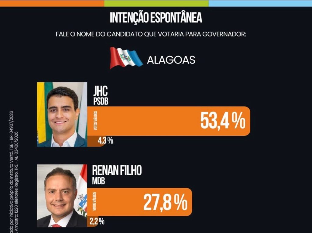 O prefeito de Maceió, JHC, aparece com ampla vantagem na mais recente pesquisa do Instituto Veritá para o Governo de Alagoas. No cenário estimulado, quando os nomes dos candidatos são apresentados, JHC lidera com 53,3% das intenções de voto, enquanto o ex-governador Renan Filho surge com 27,8%, consolidando uma diferença significativa entre os dois principais concorrentes.
