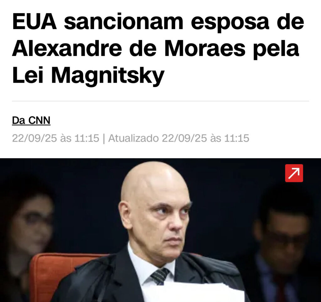 As declarações acontecem logo após Alexandre de Moraes ser incluído na chamada Lei Magnitsky, aplicada pelo Tesouro dos Estados Unidos, que funciona como uma espécie de “pena de morte financeira”. Eduardo Bolsonaro e o jornalista Paulo Figueiredo têm articulado, junto a autoridades do governo Donald Trump, a aplicação de sanções a representantes dos três poderes brasileiros, seja por meio da Magnitsky ou pelo cancelamento de vistos.